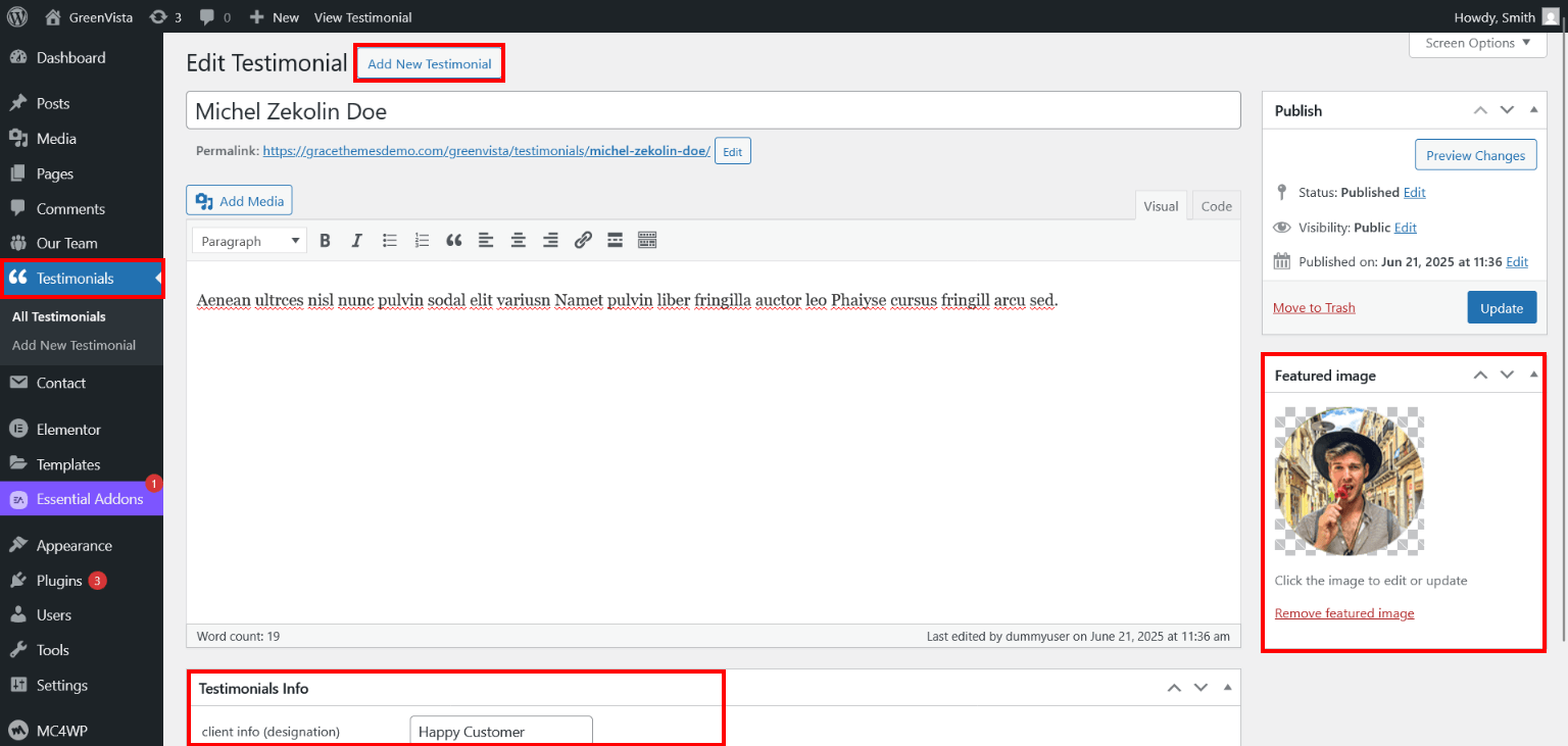 - Add Title, Description, Testimonials Info and set Featured Image