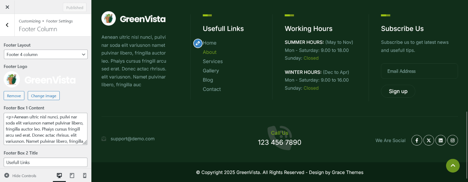 To customize the footer section, go to Appearance > Customize > Footer Settings > Footer Column