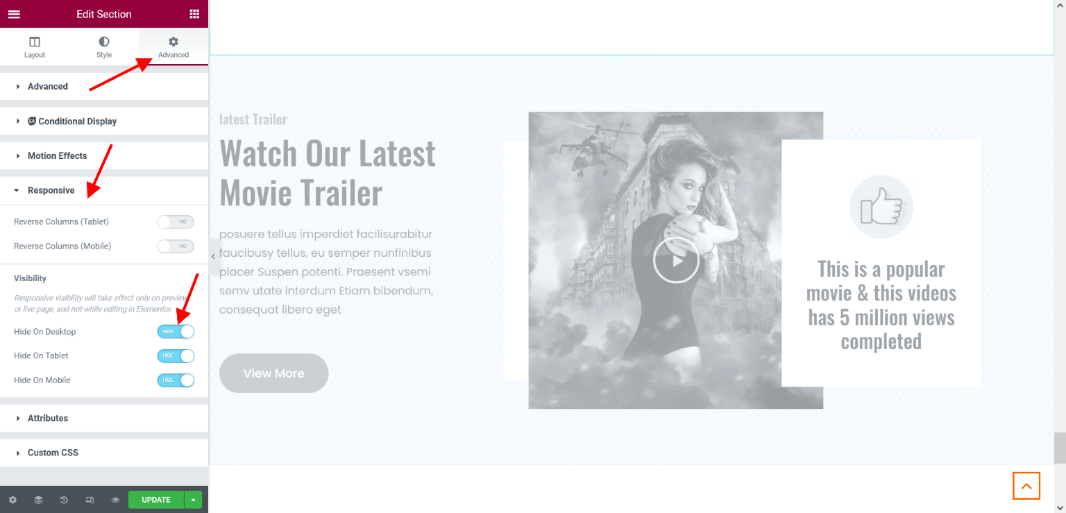 - Here you can hide the selected Section on Desktop, Tablet, and Mobile