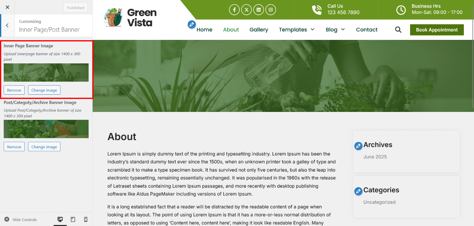 - Go to Appearance > Customize > Inner Page/Post Banner