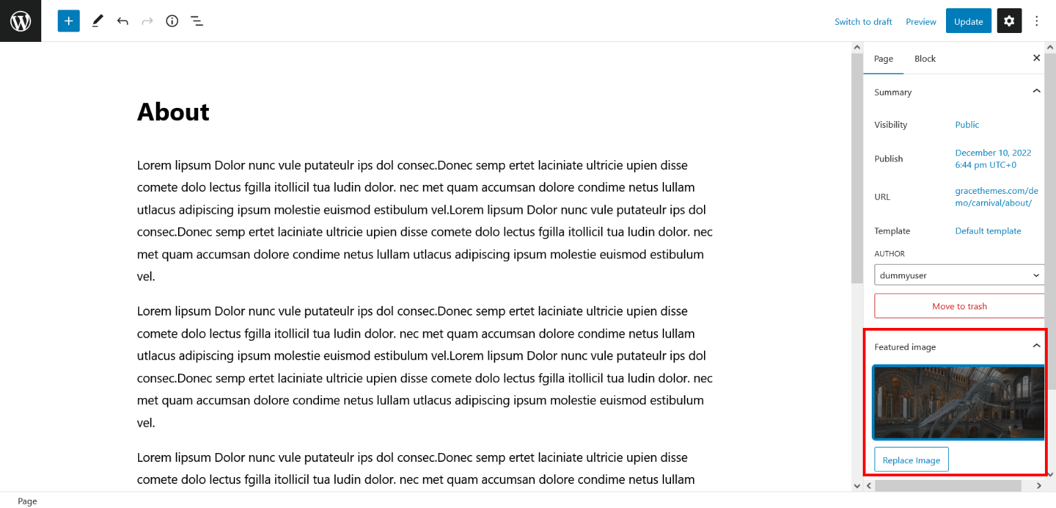 - Edit the page and set Featured Image