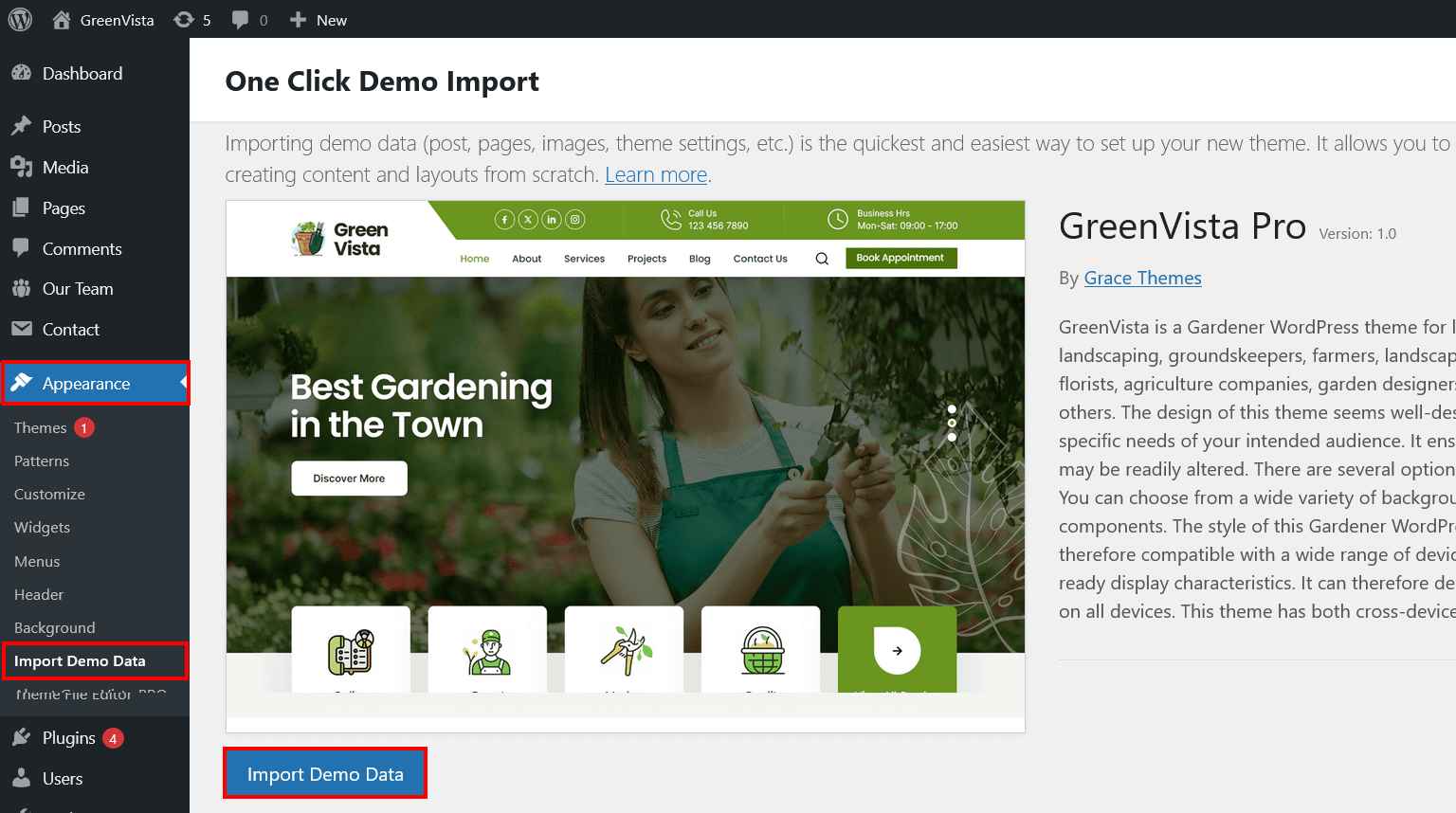 - Go to Appearance > Import Demo Data