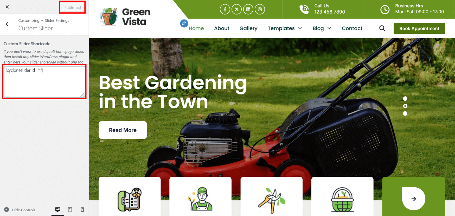 - Go to Appearance > Customize > Slider Section > Custom Slider