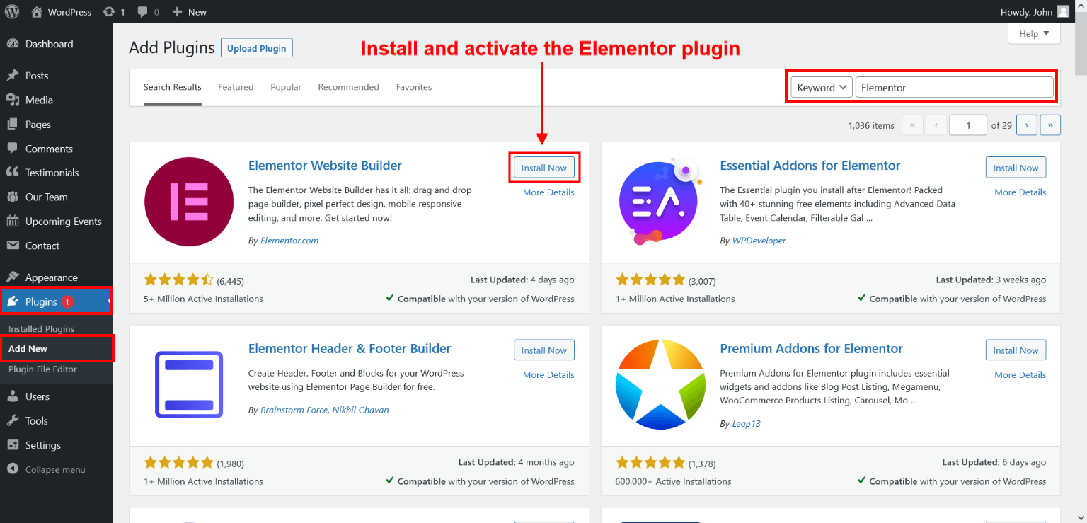 - In the Search field, enter "Elementor" and choose Elementor Website Builder to install