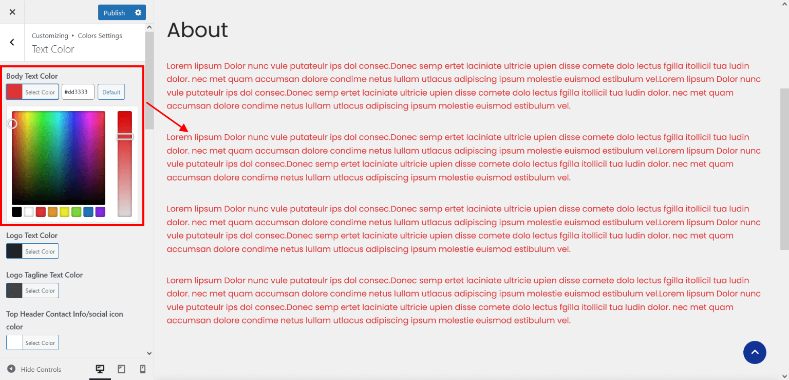 - Go to the Appearance > Customize > Colors Settings > Text Color
