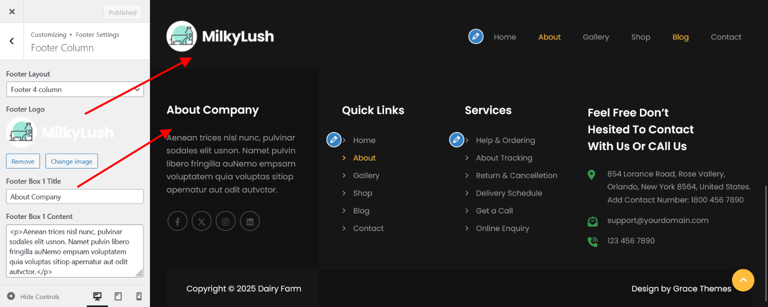To customize the footer section, go to Appearance > Customize > Footer Settings > Footer Column