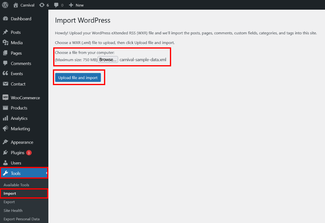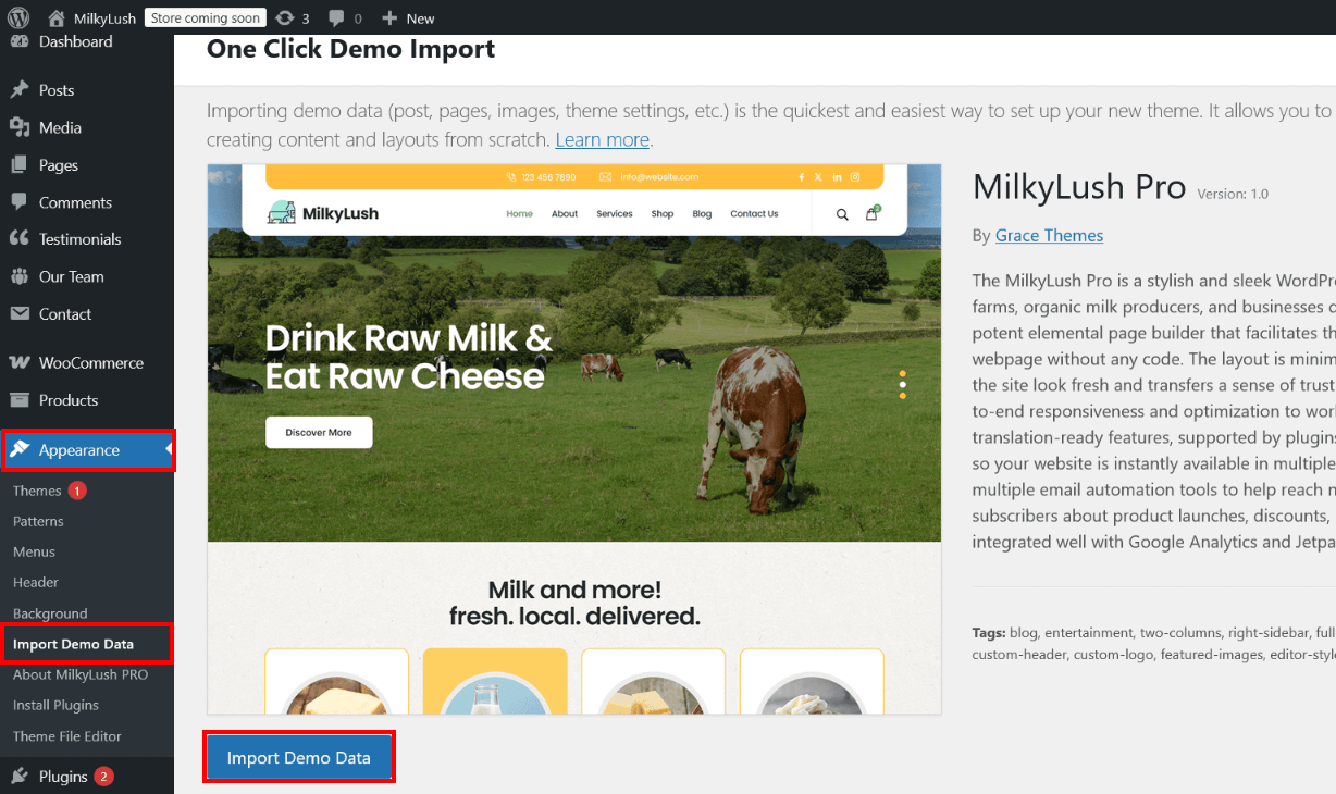 - Click on browse, select milkylush-demo-content.xml file and click on Upload file and import