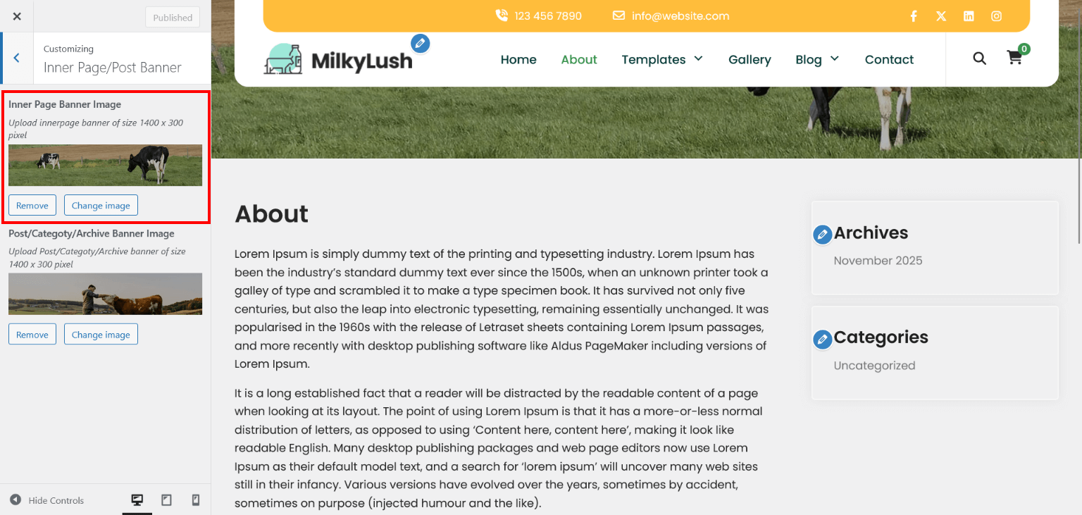- Go to Appearance > Customize > Inner Page/Post Banner