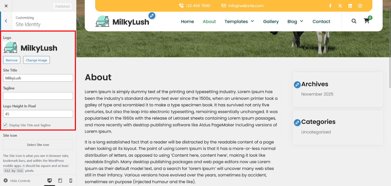 - From your WordPress Dashboard, navigate to the Appearance > Customize > Site Identity