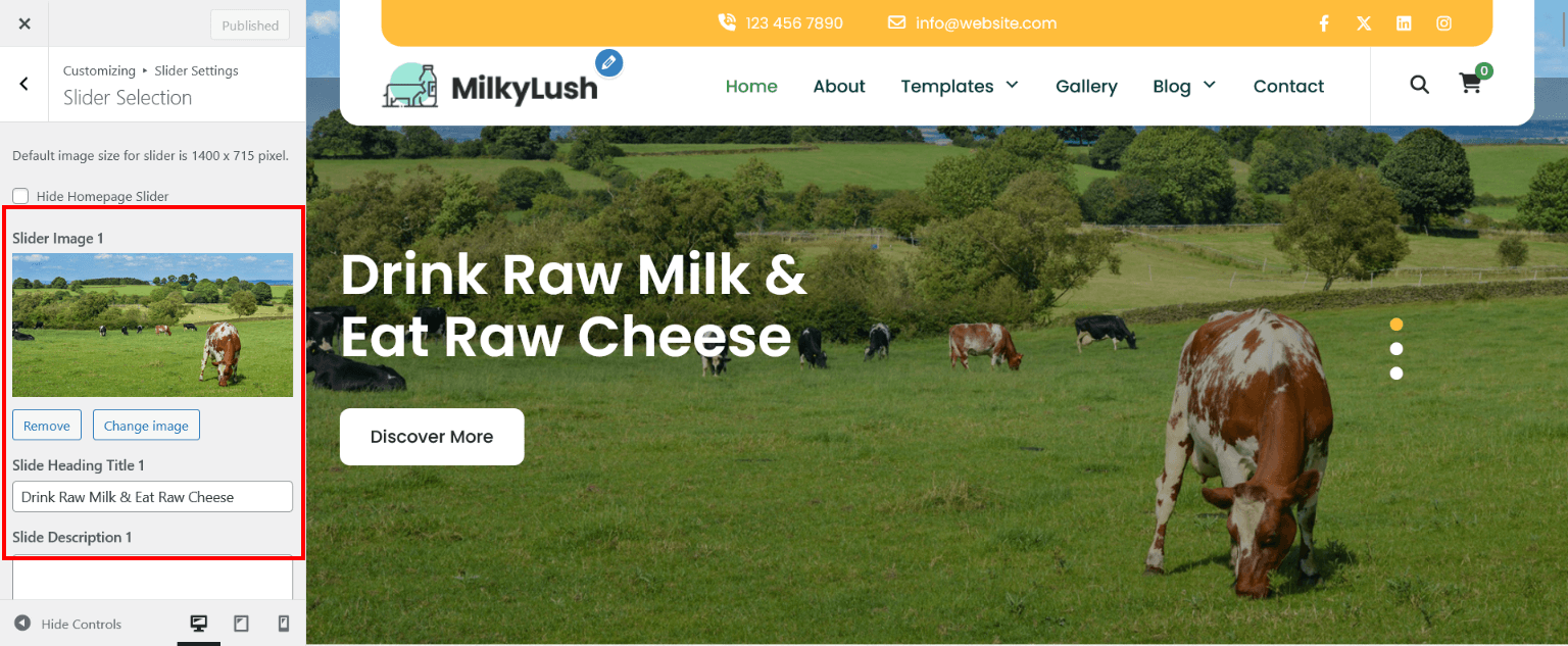 - From your Dashboard, go to Appearance > Customize > Slider Section > Slide Image Selection