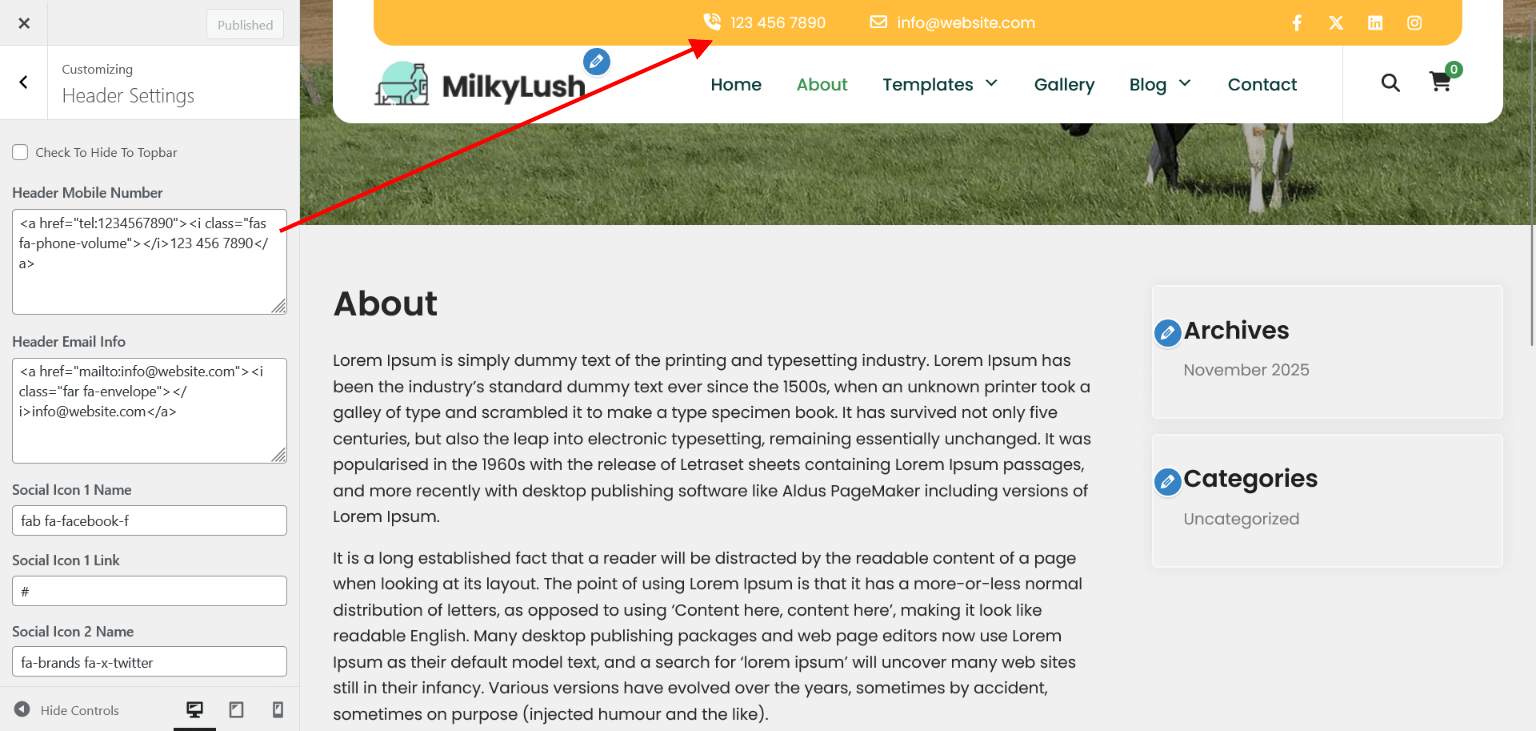 - From your WordPress Dashboard, navigate to the Appearance > Customize > Header Contact Settings