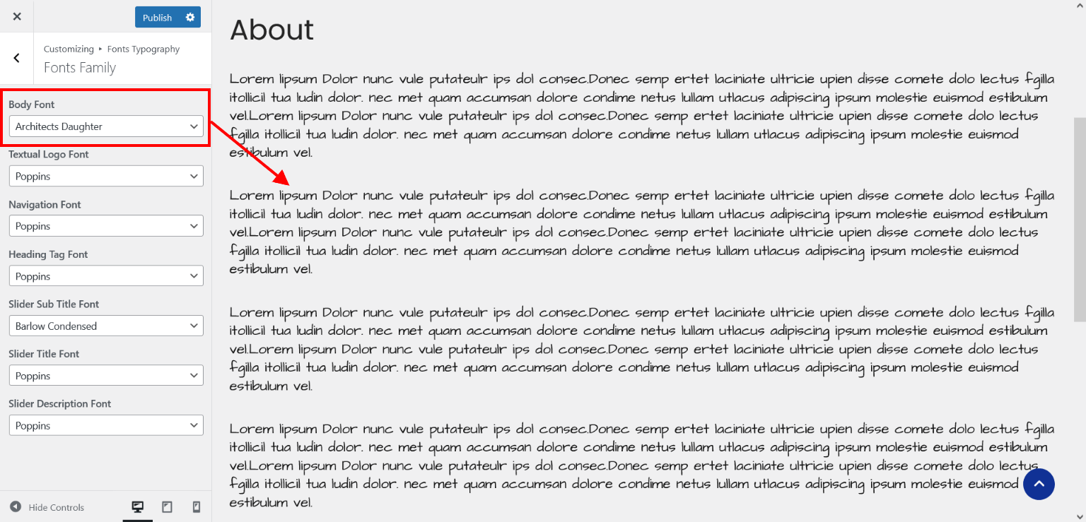 You can manage the font family and font size of body text, slider text, headings, paragraph, post/page title, button text.