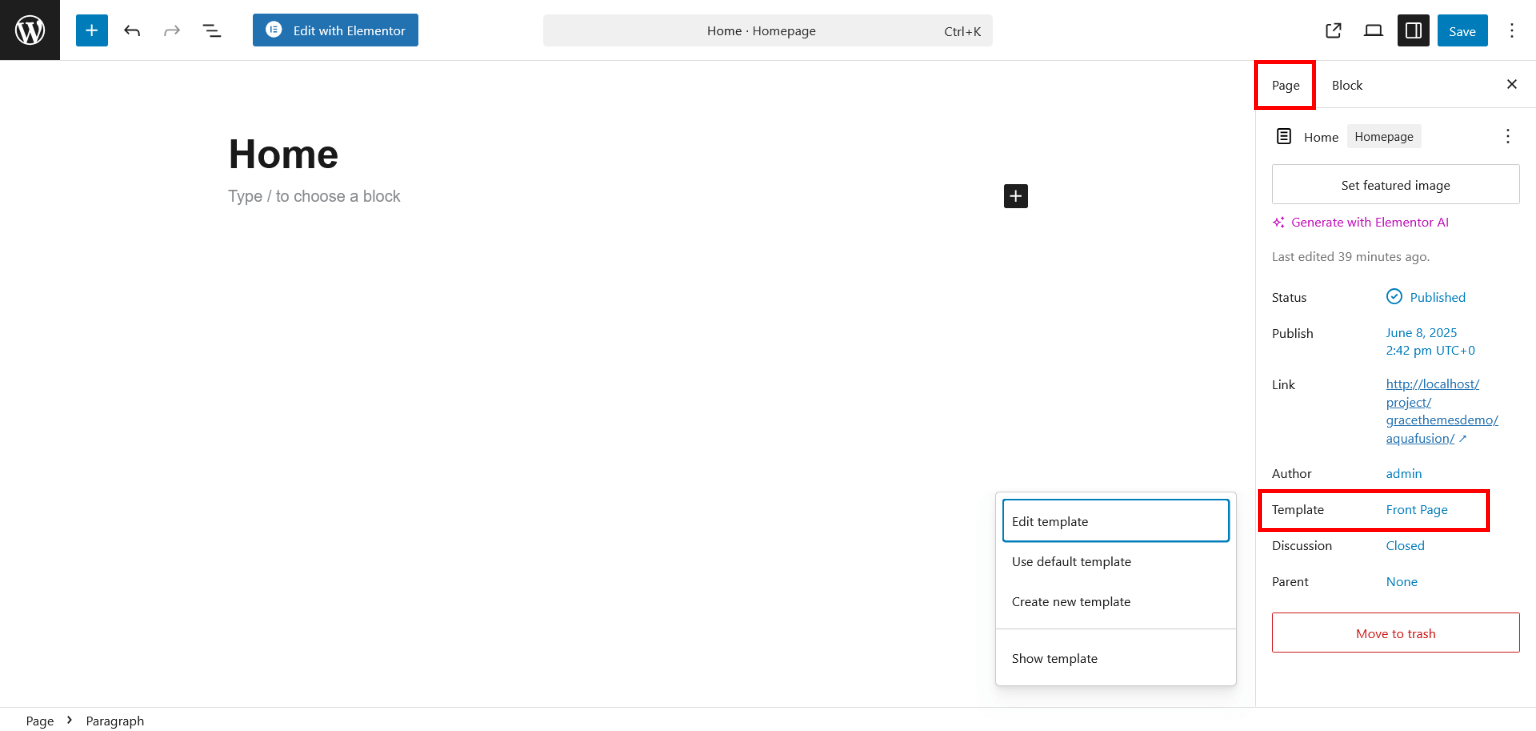 - Hover your cursor over Home page and click on Edit with Elementor